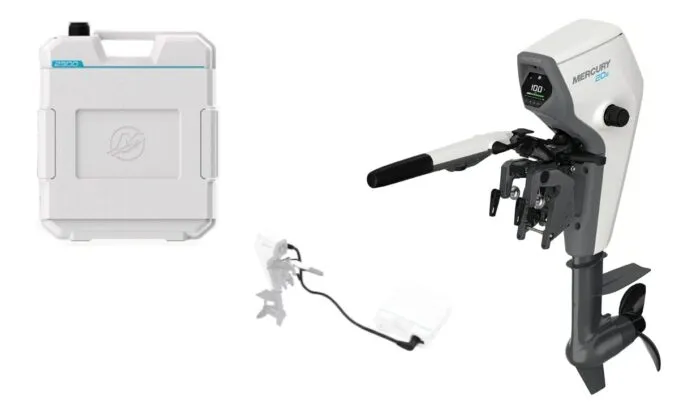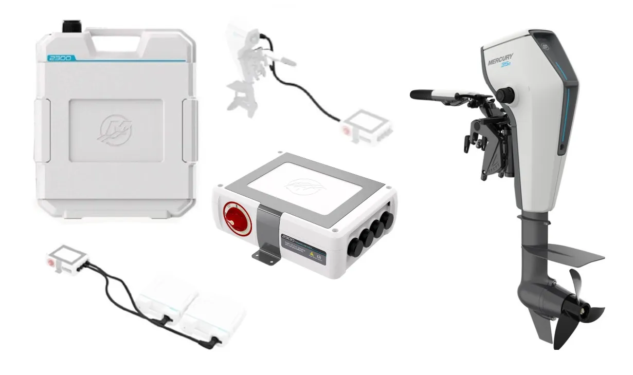 Note: Mercury Avator 35e requires two 47.8 lb./21.7 kg, 48 V batteries (each offering 2,300 watt hours), plus interconnecting Power Center option (online battery prices = $2188 per battery, plus $607 for Power Center option and ~ $380 for 1-meter wiring harnesses).