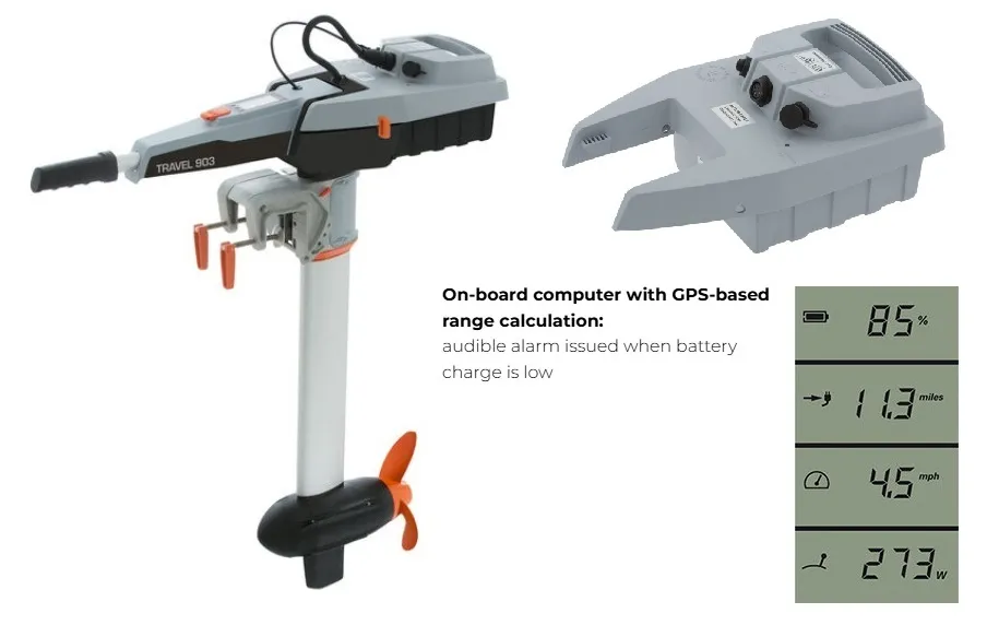 Description: The 903 is a 2023 update of the Travel 1103 said to deliver 14% greater range. The 903 is suitable for dinghies, inflatables and small sailboats up to 2,866 lb. (1.3 metric tons). All Travel models include an onboard GPS computer that delivers continuous range calculations on the pictured, tiller-mounted display.