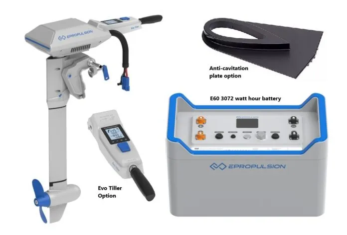 Description: ePropulsion’s Navy line was introduced in 2023. The base motor price does not include steering or throttle but is priced here with the optional Evo tiller. Requires one or more E60 batteries, with multiples in parallel or larger E163 batteries). With an optional ($250) anti-cavitation plate installed, the Navy 3.0 Evo hydrogeneration feature puts out up to 100 watts at 5 knots and 660 watts at 10 knots (so most effective with fast multihulls). Can be used with third-party batteries.
