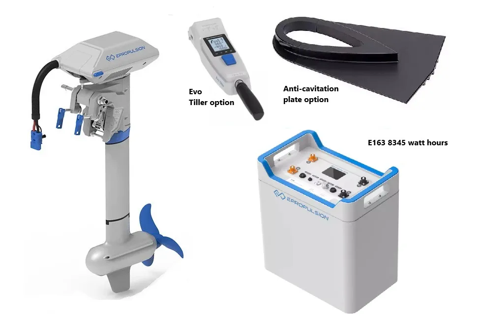 Description:ePropulsion’s Navy line was introduced in 2023. The base motor price does not include steering or throttle but is priced here with optional Evo tiller. Requires one or more E163 batteries, with multiples in parallel. With optional ($250) anti-cavitation plate and ($250) aluminum prop installed, the Navy 6.0 Evo hydrogeneration feature puts out up to 125 watts at 5 knots and 1010 watts at 10 knots (so most effective with fast multihulls). Can be used with third-party batteries.