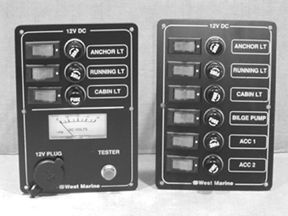 West Marine offers two entry-level 12V DC panels, both with SAE glass-fuse protection (see photo above). Although the styling of these panels is circa 1960, they are well assembled for the price ($40 for the six-position 55342 panel and $44 for the three-position 55344), which includes a 12V receptacle and analog voltage meter). The switch positions on these panels come pre-painted with Anchor Lt., Cabin Lt., Bilge Pump, etc., and do not ship with any self-adhesive circuit labels. You are going to need a P-touch label maker to customize and properly label the circuits for your specific application. The attachment method for both the main 12V positive and negative feed wires is via push-spade connectors. We prefer the security of a screw terminal attachment.