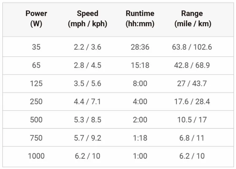 In the chart below, you can see that running full bunny (1000 W) will drain the battery in one hour, whereas running half throttle (500 W) will give you 85 percent of max speed, but double your run time, and cutting down by half again (250 W) will give you four hours at 71 percent of max speed, and so on. I feel sorry for the poor technician who spent over 28 hours going 2.2 mph just to prove the 63-mile range at that speed.