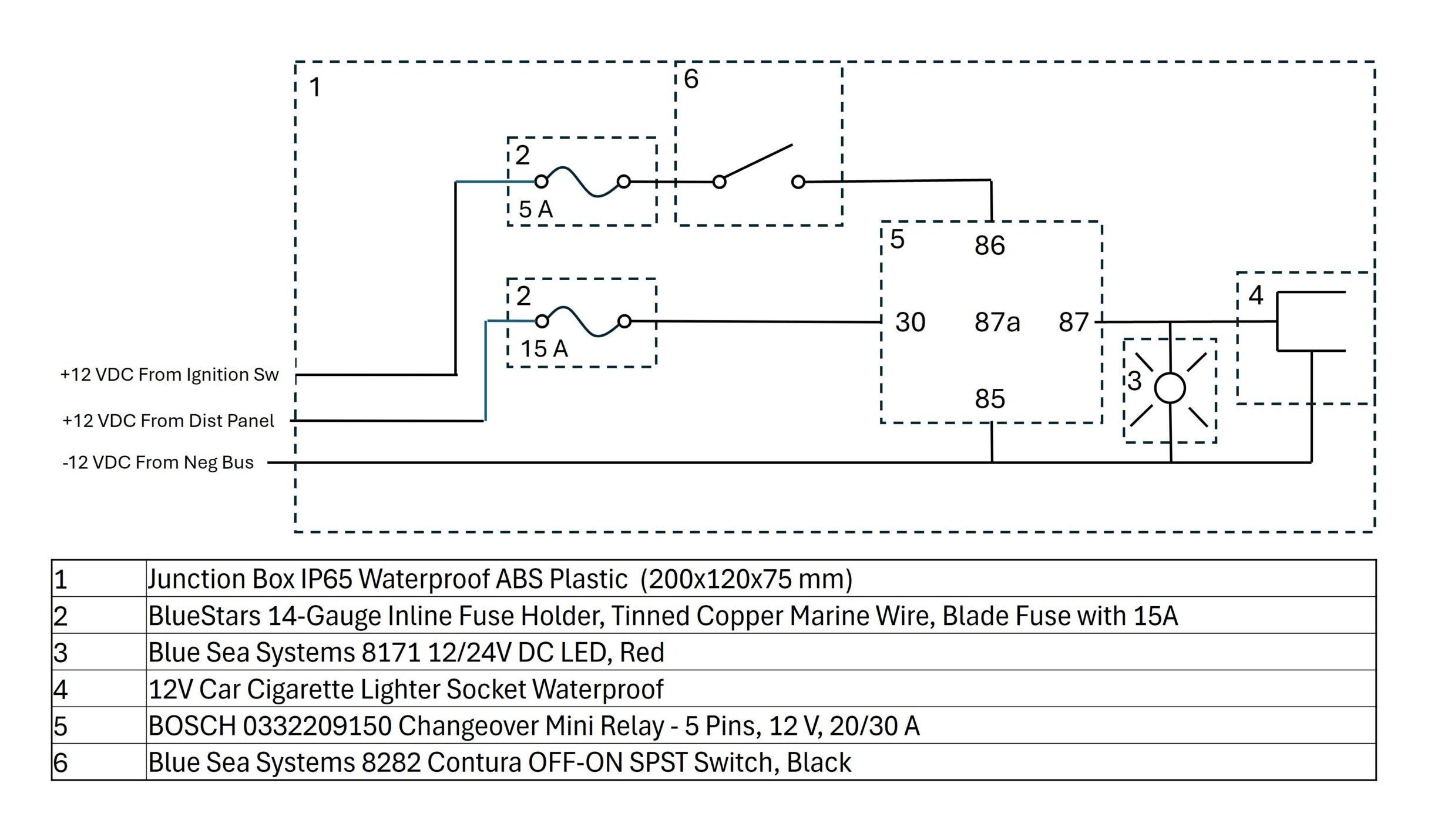 One way to prevent draining the house battery is to only charge when the engine is running. Getting the boat underway and dropping anchor at a new location can be a bit chaotic, and trying to remember to plug-in and unplug the battery during all the commotion is next to impossible, so we made a little box with a cigarette lighter plug for the ePropulsion 12 VDC charger that is only on when the engine is running. A relay wired to the ignition switch connects the battery to the charger only when the ignition is switched on. (A shout out to Keith at Marblehead Marine Electronics for checking my work and offering some advice for simplifying the design. See circuit diagram and parts list above.)