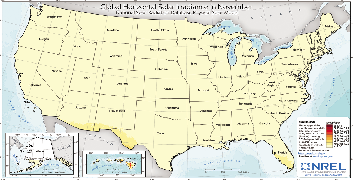 1. At first glance most coastal areas in the U.S. have the potential to generate about 5kWh per square meter of solar panel per day.