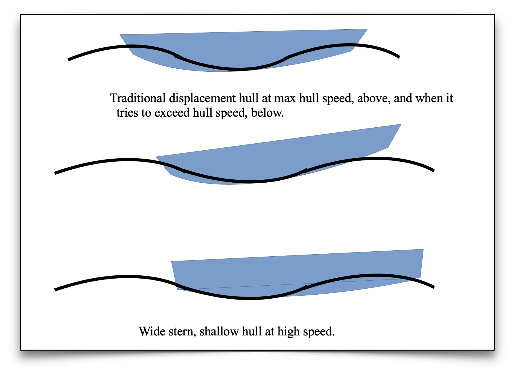 The fist two diagrams show a traditional hull shape, called a displacement hull, as speed increases. When a boat moves through the water it generates a bow wave. As the bow wave moves along the hull you get a trough midships and then a second peak at the stern. When the speed increases, the distance between the peaks increases. At its max speed (called “hull speed”), the second peak is at the stern. This speed is approximately 1.4 times the square root of the waterline length, so 6 kn for a 36-ft boat.