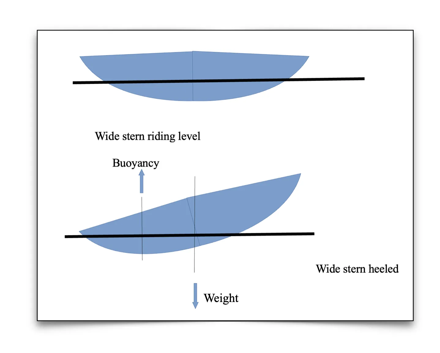There is another significant issue with wide stern designs, which causes them to become unsafe if overloaded. When a wide stern boat heels, it starts to ride on the edge of the hull and lift the windward side out of the water. See the diagram below.