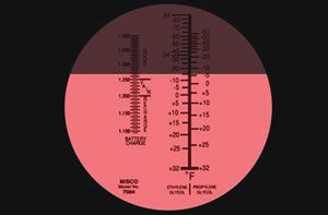 Or you can buy a tool that will last a lifetime, can be calibrated (small hidden screw on the bottom side) to read within 1 degree of the true freeze point of either PG or EG, using only a few drops, and will even read the state-of-charge on your batterys wet cells. We are speaking of the pocket refractometer, which looks like a small spotting scope.