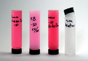 To test freezing and burst point, the vials were placed in a glycol bath in a freezer set to 0 degrees. At 20 degrees, the vial containing seawater cracked; by 10 degrees, several of the samples began to freeze; and by 0 degrees, all samples had gelled completely, except for Star brite -50, which gelled at -5 degrees. By -10 degrees, all of the samples were solid.