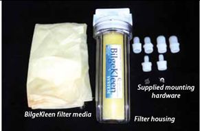 Available in a variety of sizes and flow rates, each BilgeKleen kit contains a replaceable hydrocarbon removal cartridge, hose fittings, and a clear plastic filter housing, which is mounted between the bilge pump and discharge through-hull fitting (similar to a reverse sea strainer). The kit also contains a SmartPad, which is placed in the bilge sump area to absorb oil, diesel, and gas. Used cartridges and SmartPads should be disposed of in the same way as normal oily waste (like oily rags or bilge pads).