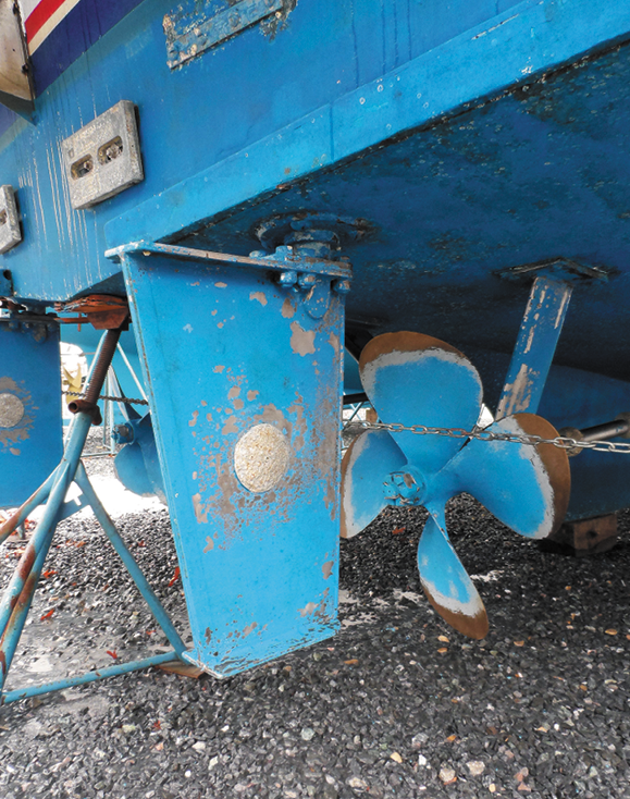 The rudder on an inboard-powered trawler or cabin-cruiser by comparison, operates in the high velocity slipstream of the propeller. It is not asked to resist the steady sideways pressure of the wind, only to provide turning force. Any additional rudder area hanging below the prop’s stream only adds drag (and draft) with very little benefit. The profile must be low drag, and as a result, many powerboat rudders are nothing more than a flat plate welded to a shaft with whatever reinforcement is required. This provides acceptable docking performance so long as the timely bursts of power are applied at the right rudder angle. Larger ships, with a lower power-to-mass ratio, require some additional help.