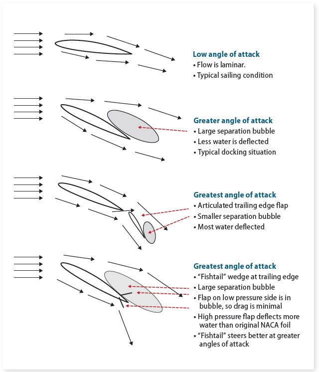 In search of new symmetrical shapes with the same high lift characteristics as an asymmetrical airplane wing, ship designers began experimenting. In fact, some ships use rudders with flapped trailing edges, like airplane flaps, but simpler. After much trial and error, simpler, non-articulating sections, referred to as fishtails, were found to have many of the same beneficial characteristics as a jet wing.