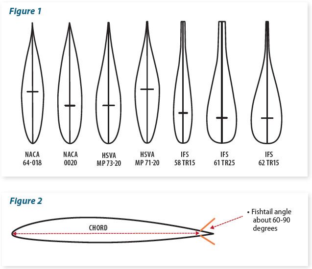 As a result, naval architects have developed different rudder sections that will operate effectively at much higher angles than traditional NACA sections we see on sailboat rudders. These convex shapes are referred to as “fishtail sections”. Examples of fishtail rudder designs are the Schilling and Thistle rudders (proprietary foil sections named by their designers), which can reduce the turning circle of a boat by as much as 50 percent. Some examples of these low-speed designs are shown alongside conventional sailboat rudder (NACA) profiles in the illustration.