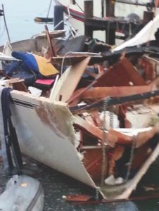 According to Brandes, the destroyed boat was an older 37-foot Hunter, Panacea, that was owned by a Swedish native. The owner had been complaining of a rat problem, and it seems that overnight, a rat chewed a hole in a flexible hose in the propane supply line. When the owner lit a cigarette in the morning, it ignited an explosion that decimated the boat, fatally injured the owner, and damaged two neighboring boats.