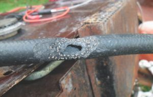 Another boat owner told our owners’ group that he discovered his LPG hose at the stove wien almost to the point of leaking. His pictures looked exactly like the one shown in the sidebar. No Rats! It was caused by leaving the stove gimbaled all the time and chafing the hose against the hull. I would guess that a rat would make a hole much more jagged than this one.