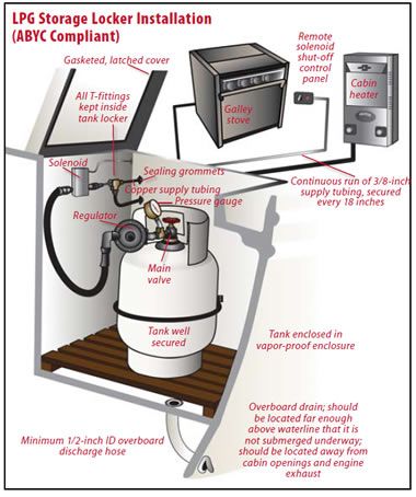 According to the American Boat and Yacht Council (ABYC), dedicated LPG storage lockers must be vapor tight to the vessel’s interior, located above the waterline, and be constructed of or lined with corrosion-resistant materials. Check that your locker has a gasketed cover that latches tightly, opens only from the top, and can be quickly opened without tools, so you can easily access the tank shutoff valve during an emergency.
