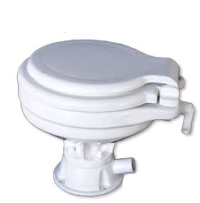 The separate white plastic diaphragm manual pump is 5¼ inches high and 7 inches wide with four flanges for securing to the bulkhead. It comes with a 12-inch stainless-steel removable pump handle that travels about 6 inches with each pump stroke. The top or front of the pump has a wide opening with a screw-on lid to access the rubberized bellows of the pump for cleaning.