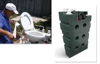 The top of the tank has a 5/8-inch discharge fitting exiting the air pump to evacuate the foul odors while the air pump creates a vacuum. There is no vent in this system. The vacuum pump is quiet, but it takes longer for the system to reach a full vacuum. When powered up, the tank can take up to three minutes to reach a full vacuum after each use. This time becomes shorter as the tank fills.