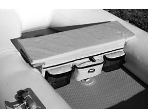 Essentially, it consists of a heavy-duty polyester sleeve that wraps around the seat and is held on with a strip of hook-and-loop tape. The top surface is padded, and there’s a 28″ x 10″ x 7-1/2″ bag that hangs below the seat. This bag has two stainless drain grommets at the bottom and a mesh panel mounted high up against the seat at the rear. On later-model inflatables with tubes larger than 15″ diameter, the bag’s bottom hangs clear of the sole.