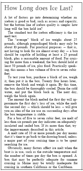 There is a good chance you can significantly improve the efficiency of your boat’s icebox without major modifica-tions. Most boatbuilders do a poor job of building iceboxes because building a good one is relatively expen-sive. A good box could easily add hundreds of dollars to the cost of a 30′ production sailboat.