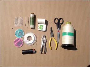The thread needs to be strong and UV resistant. The Goretex thread (available from Sailrite, www.sailrite.com) meets that bill, as does waxed dental floss, which also holds a knot better. The small needle-nose pliers and vice grips are used to put a needle through thick cloth. We carry the following for sewing needs:
